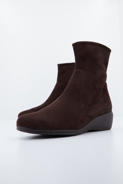 Botines con cuña de la marca PINOSOS. Exterior en ante de color MARRÓN OSCURO. Con cremallera interior para facilitar el calce. Suela de goma.